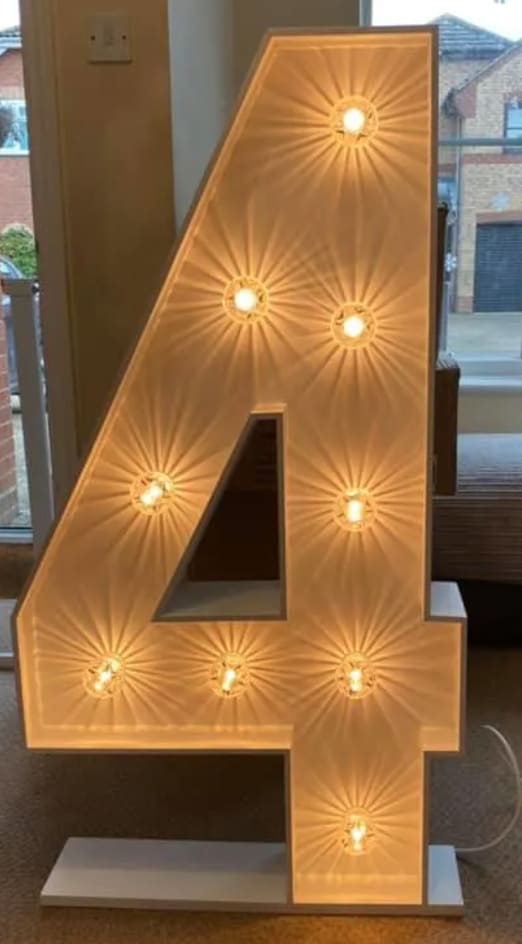 We specialise in light up number hire, offering our 4ft white light up number 4 in Essex, Suffolk, Norfolk, London, Hertfordshire, and Colchester. Our experienced team ensures on-time delivery, professional setup, and hassle-free collection, so you can focus on enjoying your event. Trust us to add that extra sparkle and style to your celebration! 🎈
