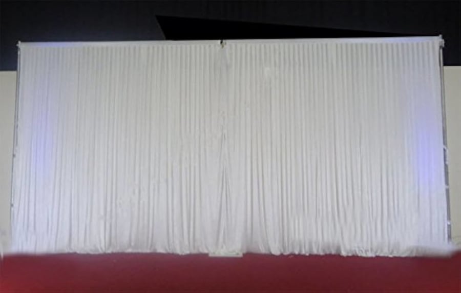 Drape Hire 6m x 3m White Pleated Drape in Colchester, Chelmsford, Maldon, Brentwood, Chigwell, Essex, London, Greater London gives your venue a crisp, professional look. This white pleated drape creates instant impact. Use it as a stage backdrop, ceremony wall, or room divider. Perfect for weddings, corporate events, exhibitions and private parties. ✨🏛️