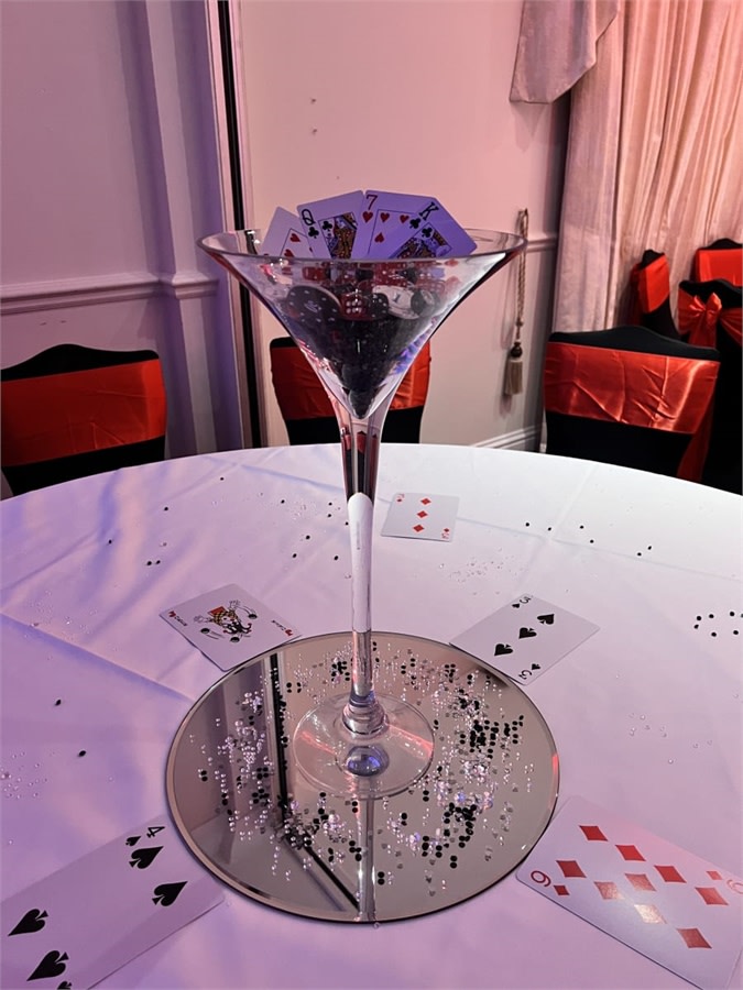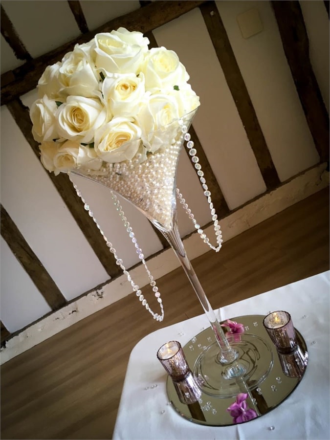 Wedding Table Centrepiece Hire Large Martini Glass Centrepiece in Colchester, Chelmsford, Maldon, Witham, Southend on Sea, Brentwood, Romford, Basildon, Chigwell, Essex. Our large martini glass table centrepiece is a striking focal point for weddings and corporate events. Custom-made to match your colour scheme and theme, it arrives ready to impress. Comes complete with a mirror plate for added sparkle. ✨