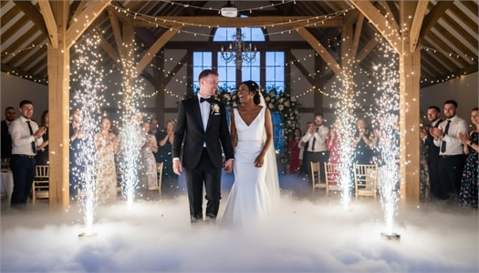 Many couples choose to transition their arrival directly into first dance effects to maintain the momentum. In our 2023 season, 92% of Essex hotel venues approved our dry ice machines because they use solid CO2. This doesn't trigger ionisation smoke detectors, which is a common concern at historic locations like Prested Hall or Braxted Park. For those wanting extra flair, our cold sparks are touch-safe and operate at approximately 60°C, providing a breathtaking, safe backdrop for your debut.